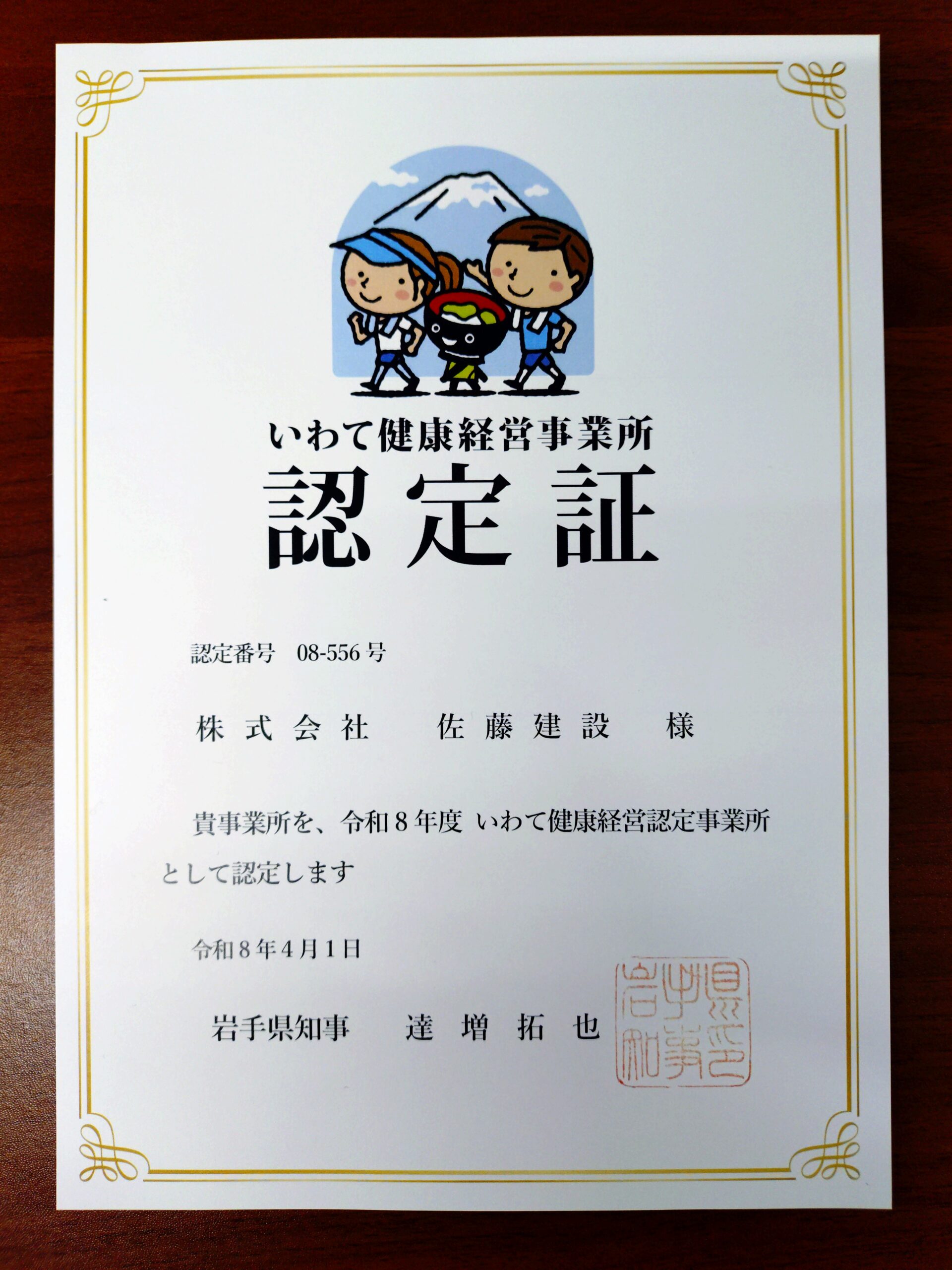 今年度も継続して認定されました。 投稿日: 2026年4月21日2026年4月21日 投稿者: 佐藤建設 健康の取り組みを継続して行い、令和8年度 いわて健康経営事業所として、岩手県知事より認定証をいただきました。 今後も健康経営の取組に力を入れていきたいと思います。