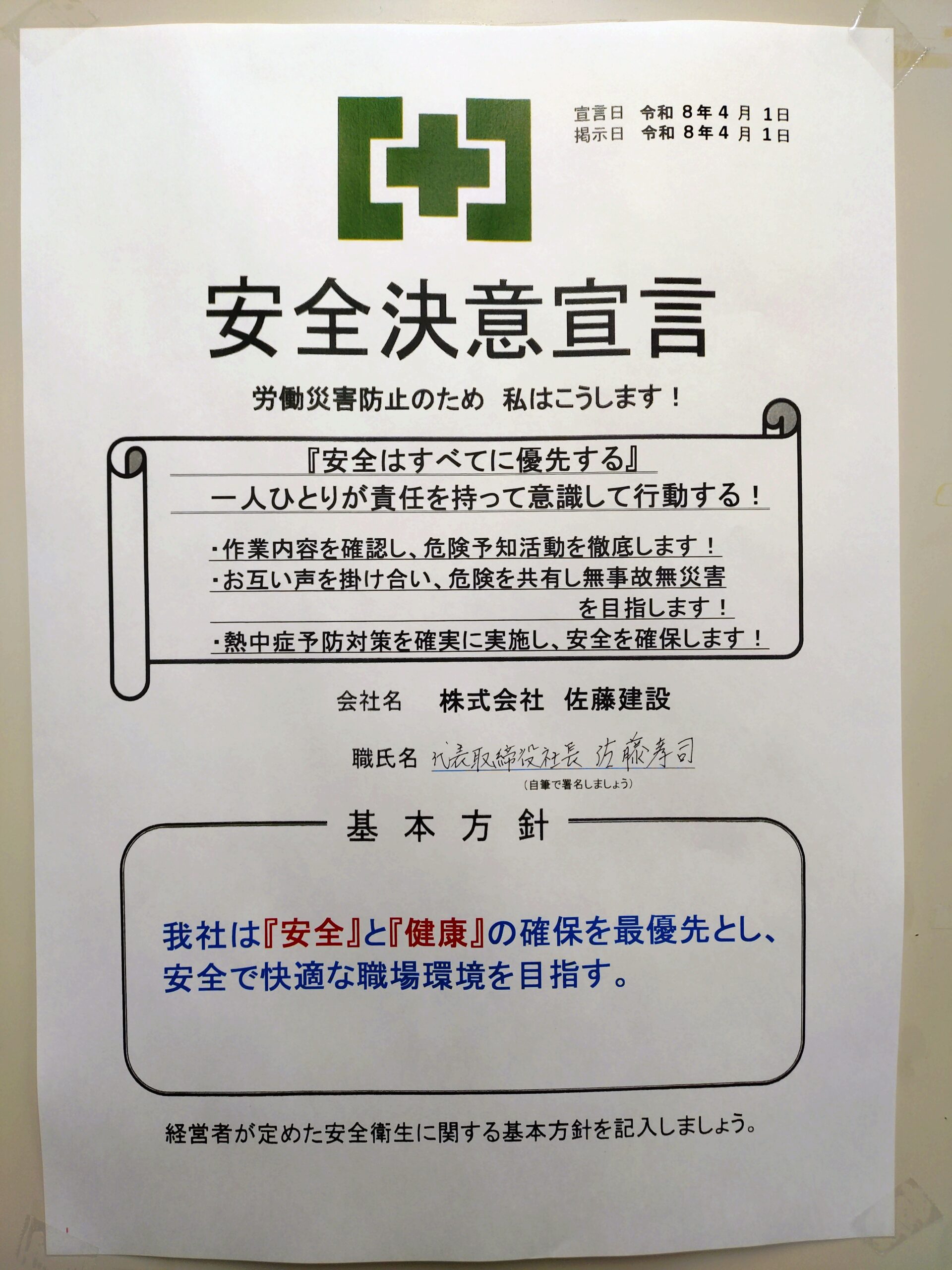 令和8年4月1日、安全決意宣言を社内に掲示しました。